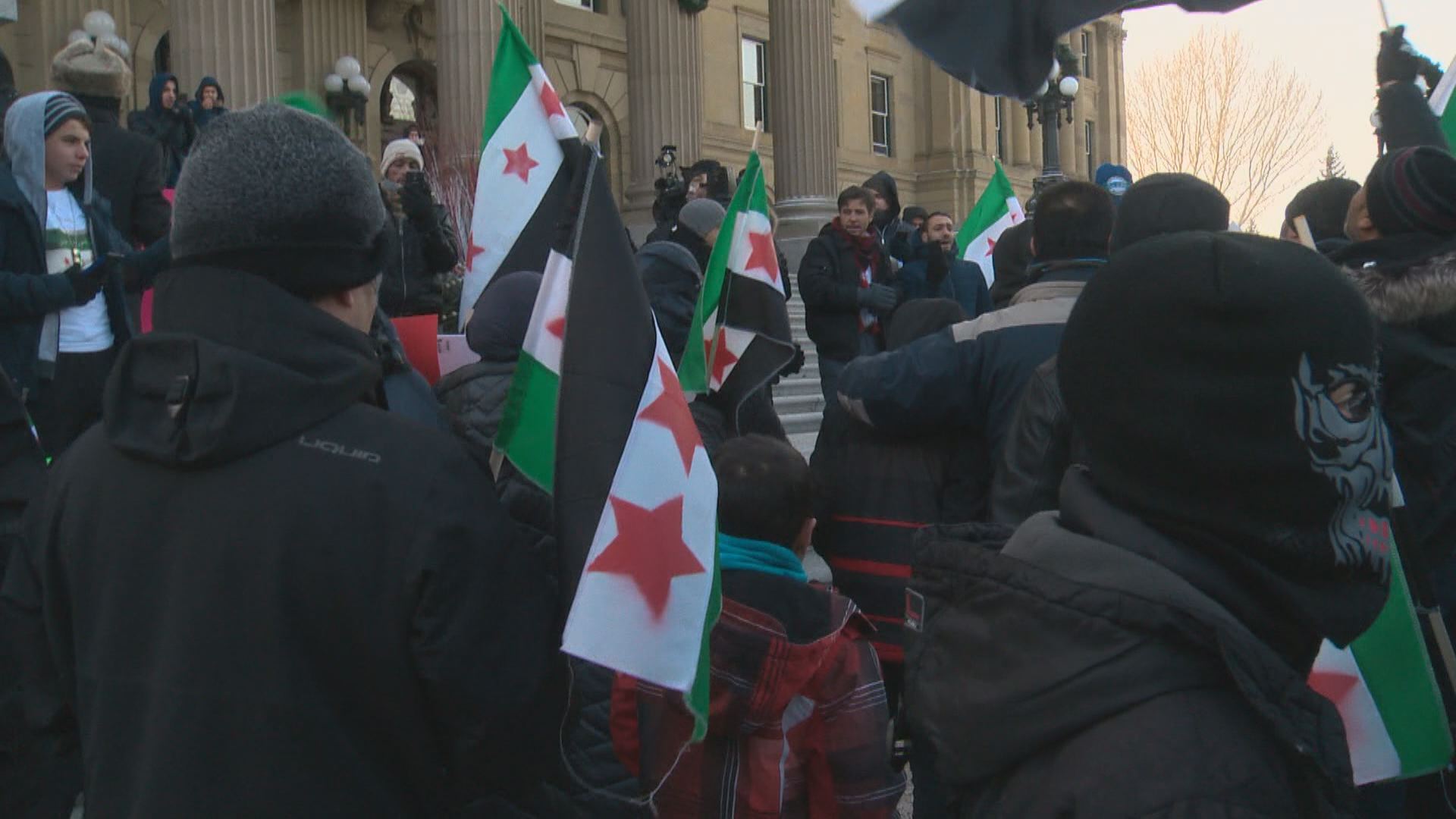 Hundreds of Syrians and Canadians of Syrian descent gathered on the steps of the Alberta Legislature Saturday to ask the Canadian government to help those left behind in their homeland.