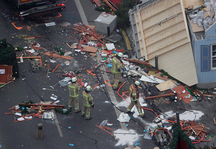 The truck smashed into wooden huts serving mulled wine and sausages at the foot of the Kaiser Wilhelm memorial church, one of west Berlin’s most famous landmarks, around 8 p.m. on Monday. Forty-five people were injured, 30 severely.