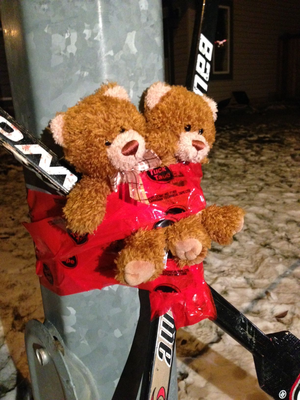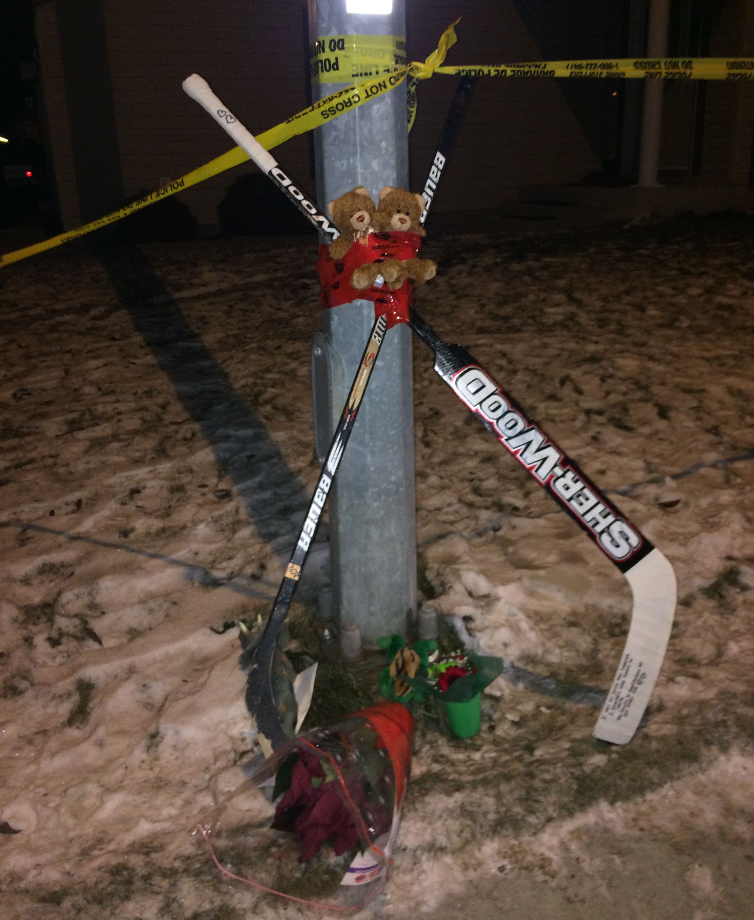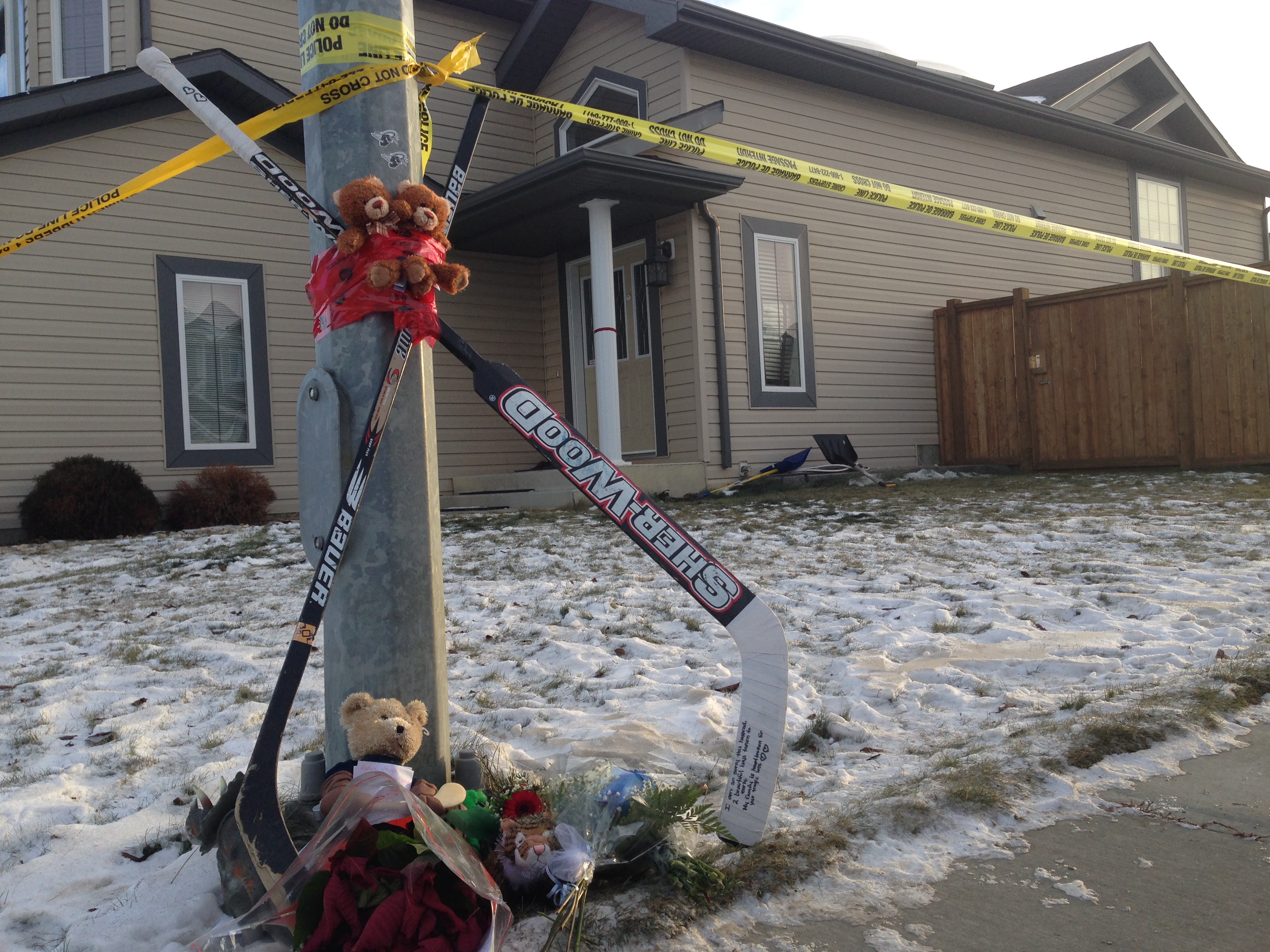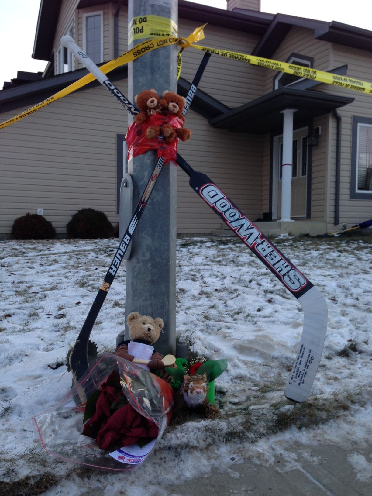 Two hockey sticks, several teddy bears and a collection of flowers formed a memorial on the front lawn of the home west of Edmonton Tuesday.