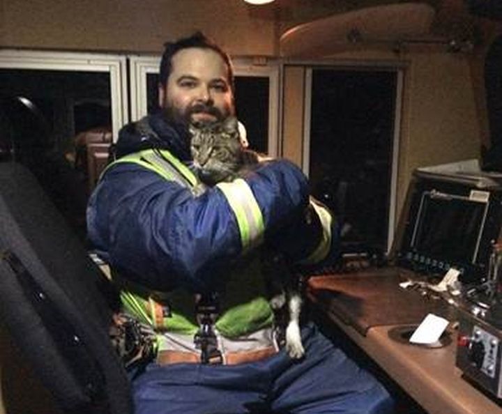 “I got to the second engine and I heard the saddest cat cry. And I’m looking around and I’m like, ‘What?’ I’m shining my light and I see these eyes… There’s a cat,” he said.