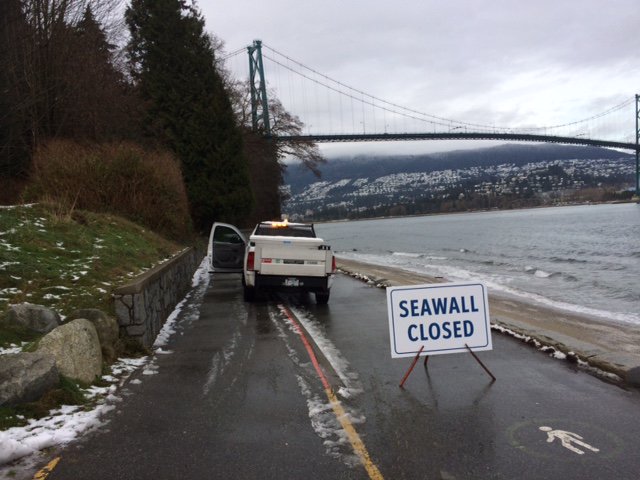 Large pieces of ice falling onto Stanley Park Seawall near Siwash Rock have caused a closure that could last into the weekend.
