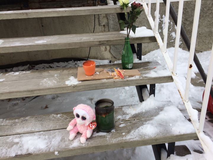 Candles, flowers, a stuffed animal and a card sit on the steps of the house at 122 Avenue and 132 Street in memory of Rachael Longridge.