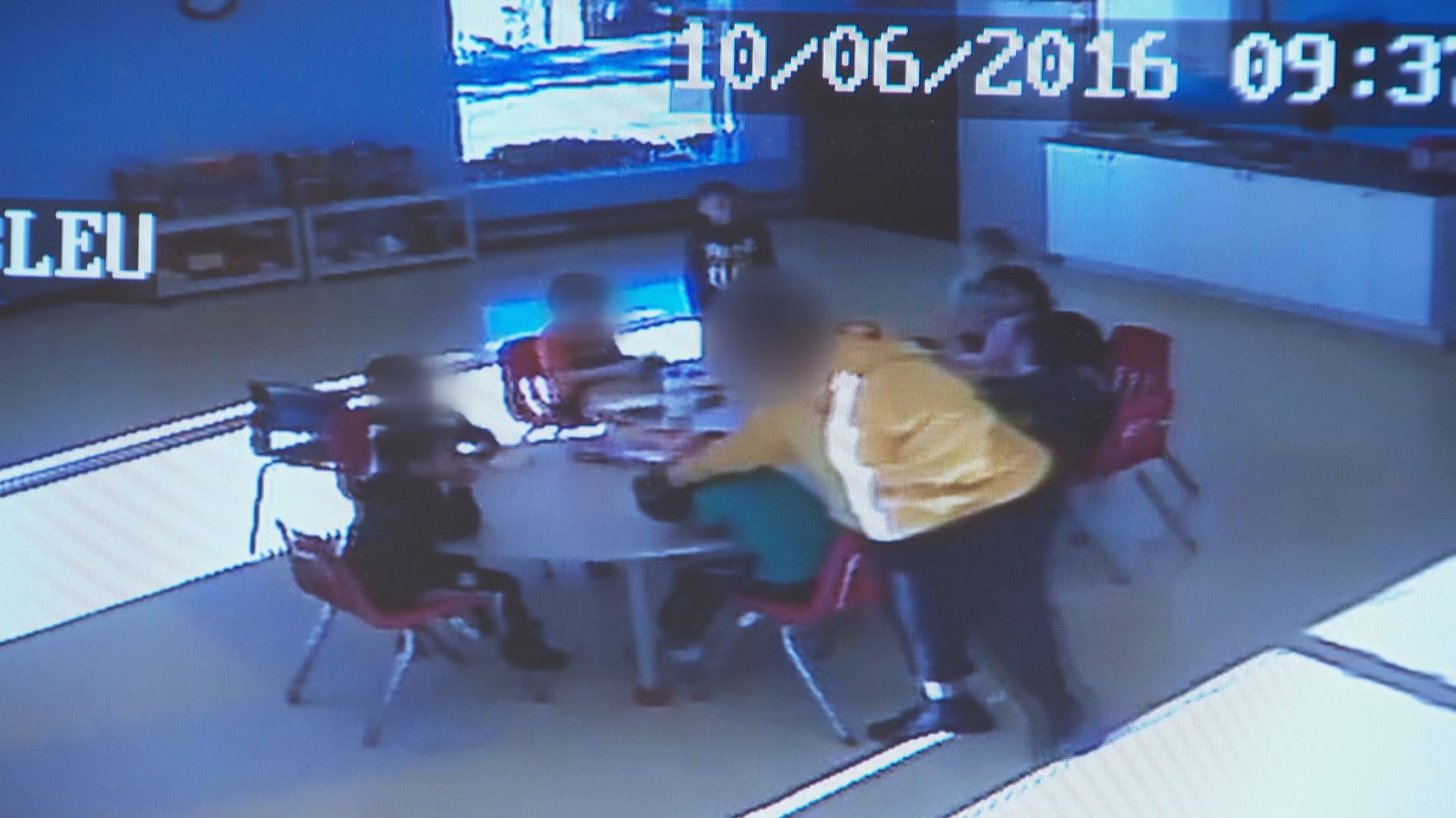 A video shows the educator attempting to get the group under control before appearing to forcefully push two of the children’s heads down towards the table.