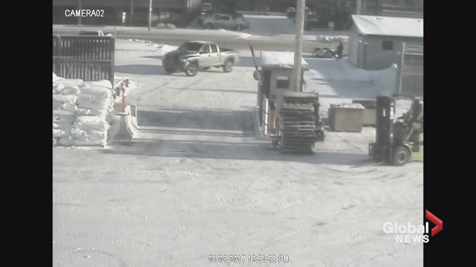 A company that was terrifyingly close to a series of hit-and-run collisions Tuesday has shared its surveillance footage with Global News.