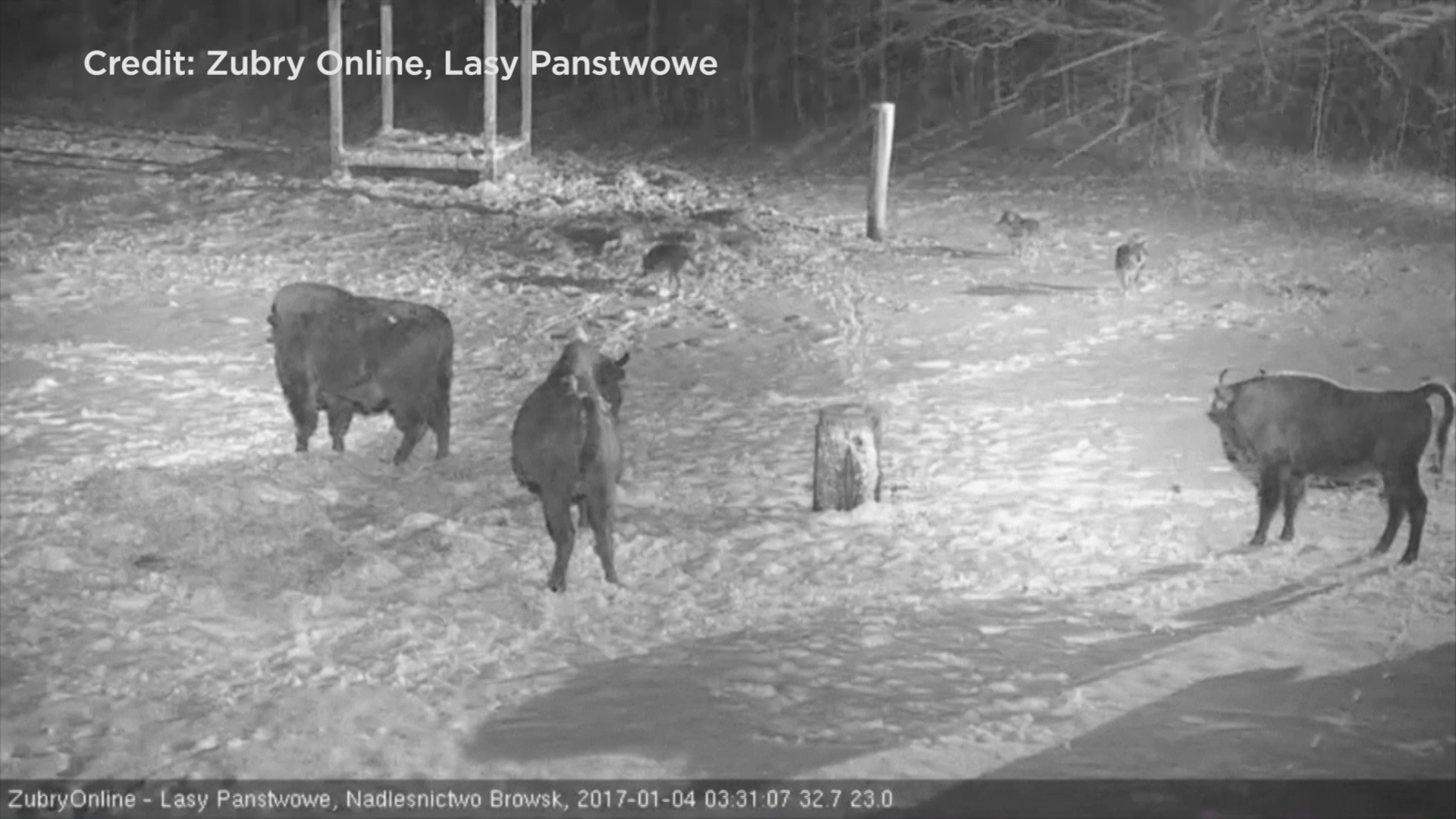 An online camera installed by state forestry authorities at a clearing in the Bialowieza forest caught the bison standing up for their own and charging the wolves on Wednesday.