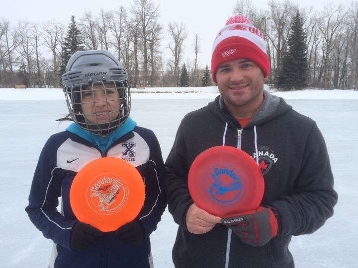 He’s coaching fellow Calgarian Jill Duffy on the fine points of the sport, in which participants throw a Frisbee and then skate hard to catch it.