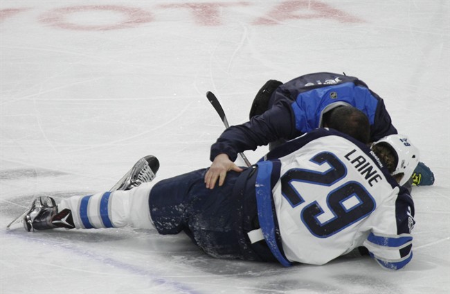 The NHL rookie scoring leader was injured in the third period of Saturday’s games in Buffalo, N.Y.. Laine was looking down at the puck when Sabres defenceman Jake McCabe levelled him with an open-ice hit. Laine appeared to hit the back of his head on the ice as he fell. He was down for several minutes before being helped to the dressing room. McCabe was not penalized for the hit.
