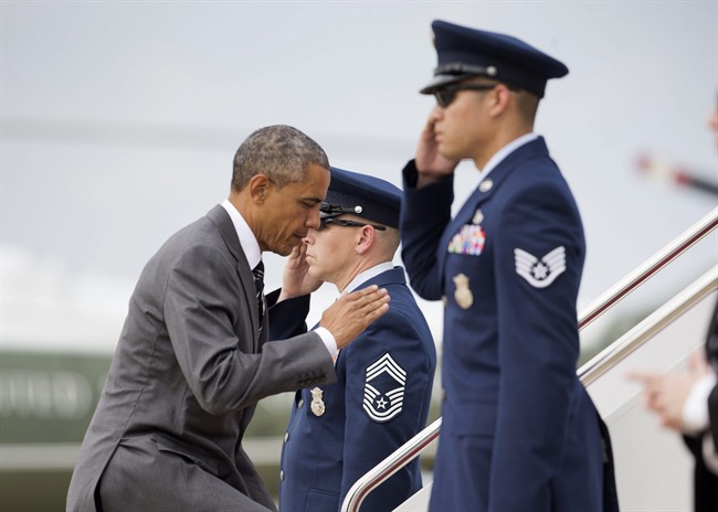 Before the flight to Chicago, Obama spent time with the members of the Presidential Airlift Group, the Air Force personnel who take care of Air Force One.