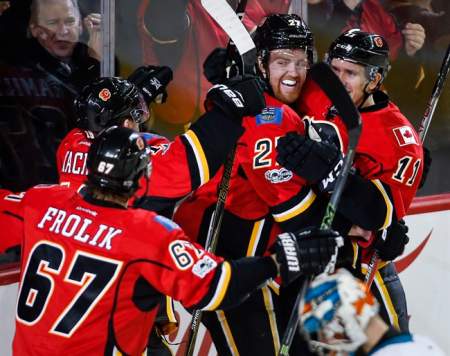 Frolik, who was in the penalty box serving a slashing penalty when Couture scored, then answered right back for the Flames at 11:22. Thanks to a nice second effort, Frolik shovelled a rebound past Dell to atone for his penalty.