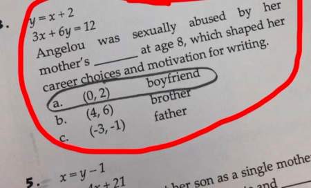 The assignment focused on Maya Angelou and her autobiography “I Know Why the Caged Bird Sings.” It provided an algebra formula that asked: “Angelou was sexually abused by her mother’s — at age 8, which shaped her career choices and motivation for writing.” Pennridge High School students needed to solve the formula before deciding whether the answer was boyfriend, brother or father.