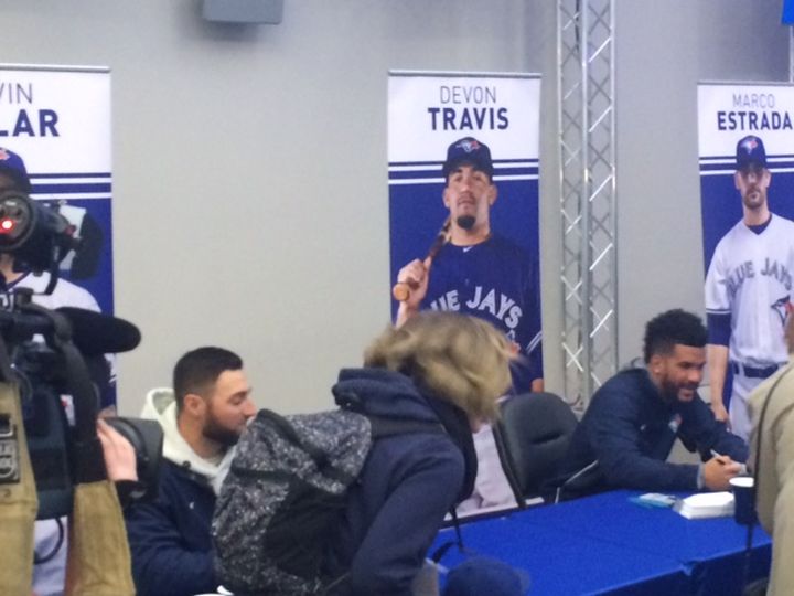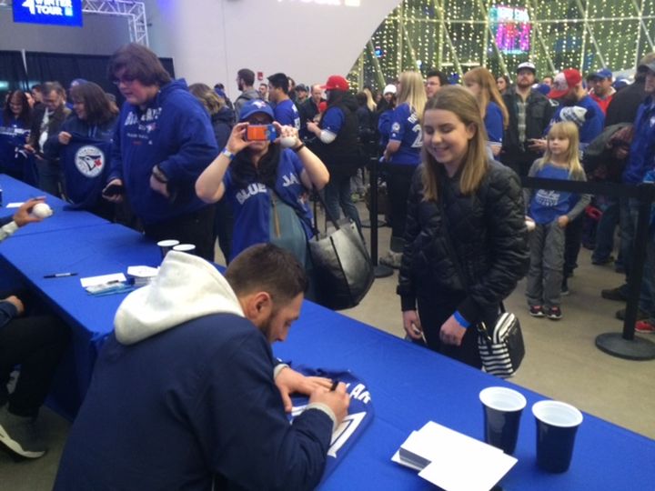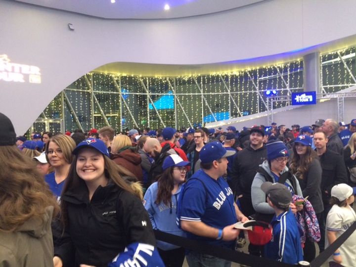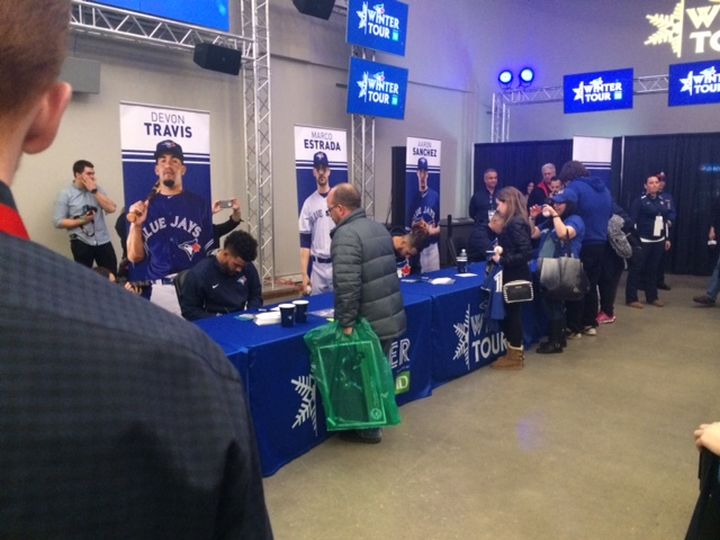 A sea of blue greeted the Jays’ Kevin Pillar, Marco Estrada, Aaron Sanchez and Devon Travis as they arrived at Edmonton’s downtown arena for an autograph session on their winter tour.