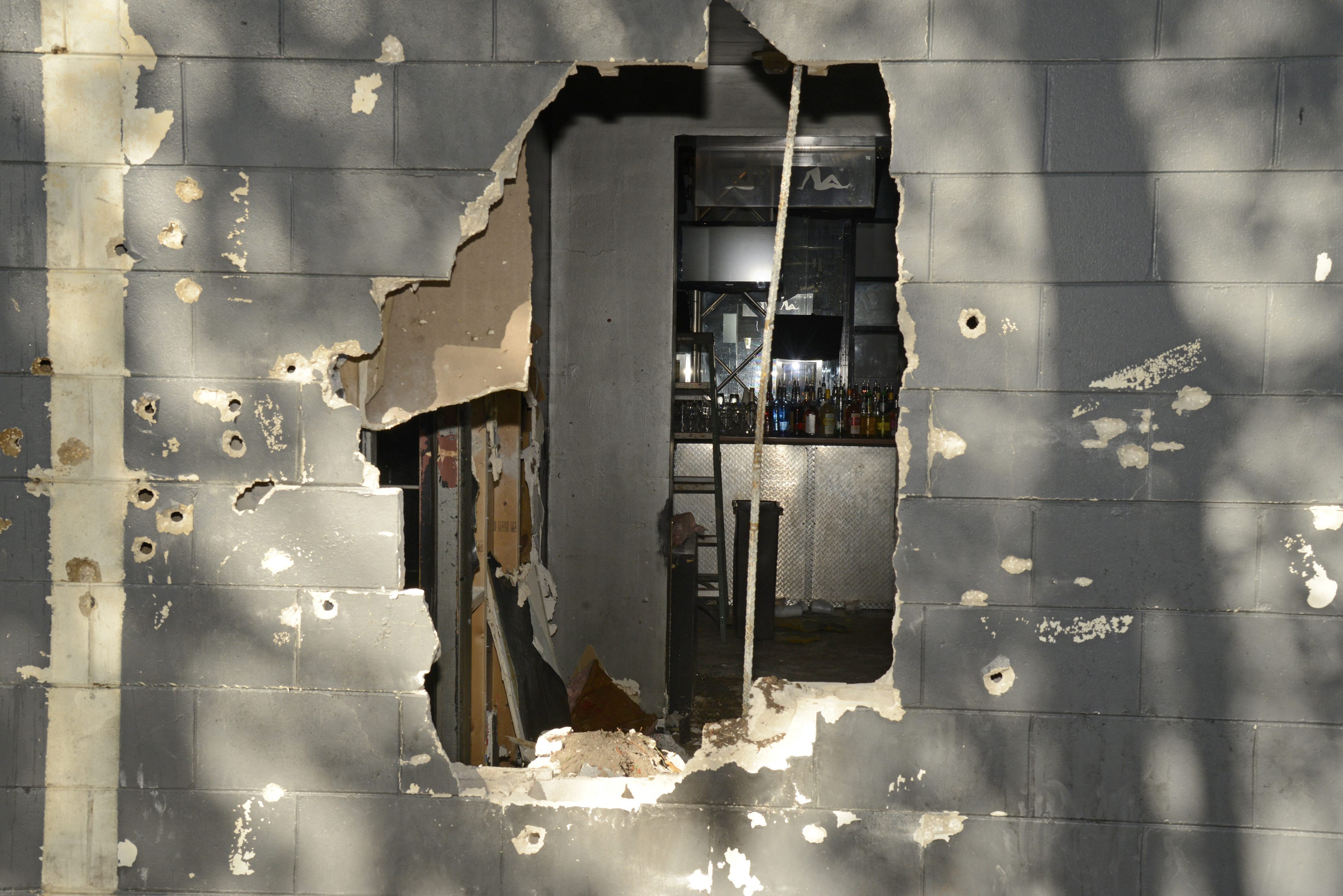 The photos released Tuesday show large punctures to an exterior cinderblock wall of the nightclub. On the other side is a bathroom where patrons were trapped for more than three hours.