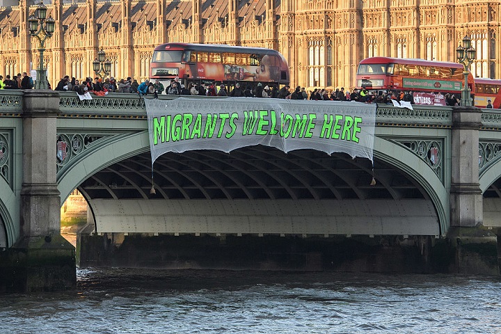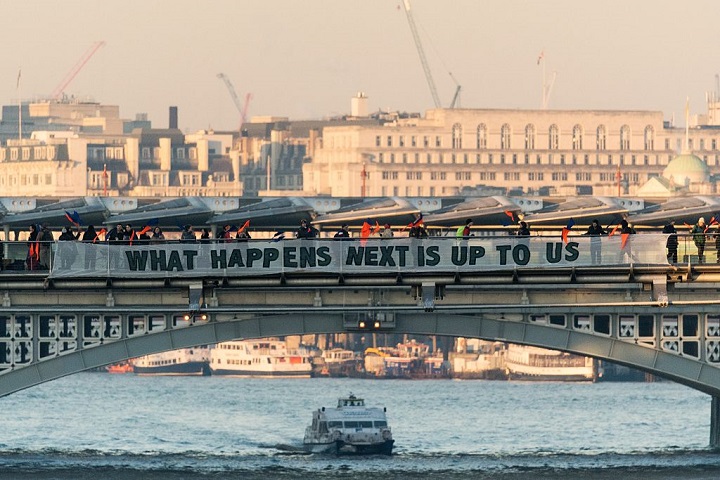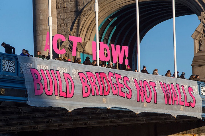 A banner reading “Build bridges not walls” was draped across London’s Tower Bridge Friday. Protesters on the iconic bridge held up pink letters reading “Act now!” soon after sunrise, while others unfurled the banner over the railings and a speedboat with a black flag reading “Build bridges not walls” raced down the River Thames.