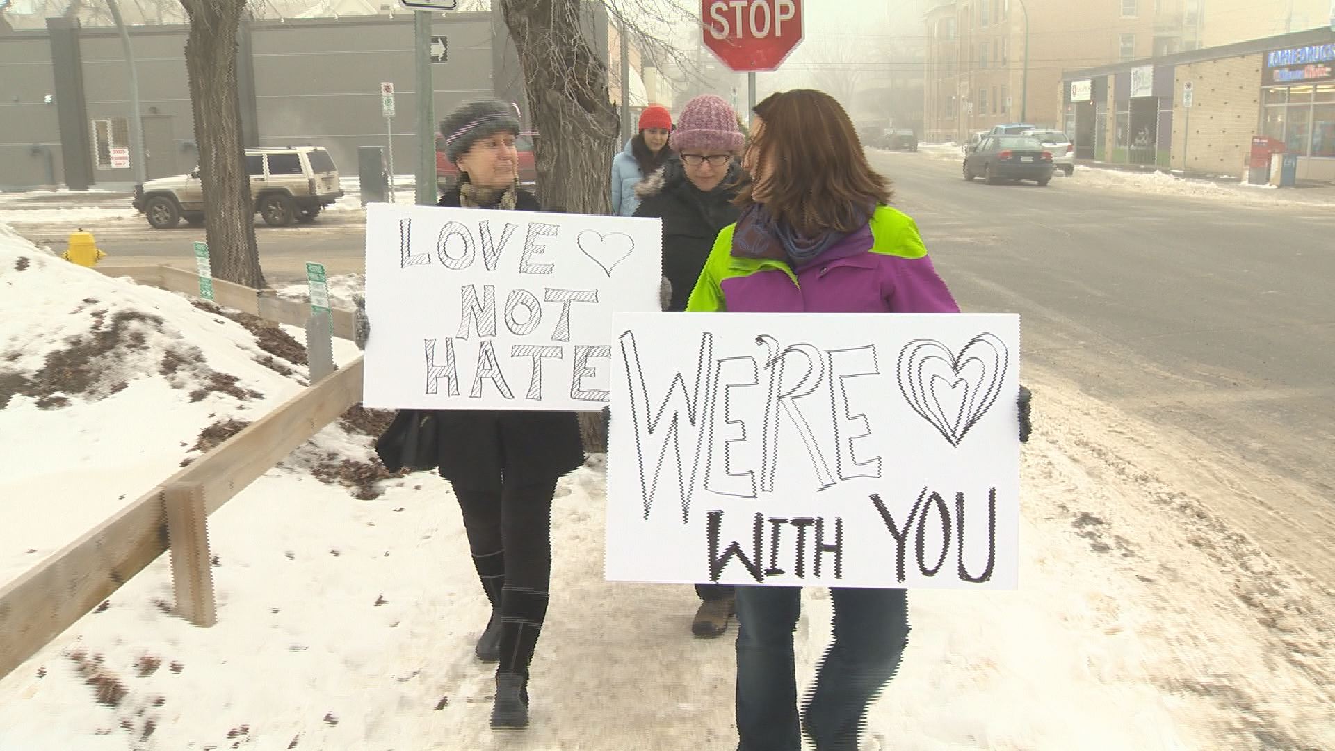 Close to a dozen women and men hit the streets to the Legislative building to promote messages of love and unity.