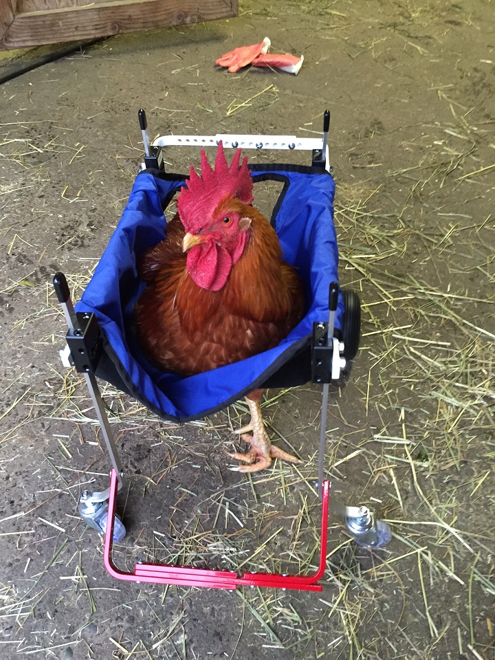 A rooster in a wheelchair