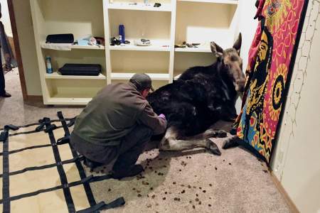 She says the basement room suffered little damage and called the moose “the most polite, gracious beast.”