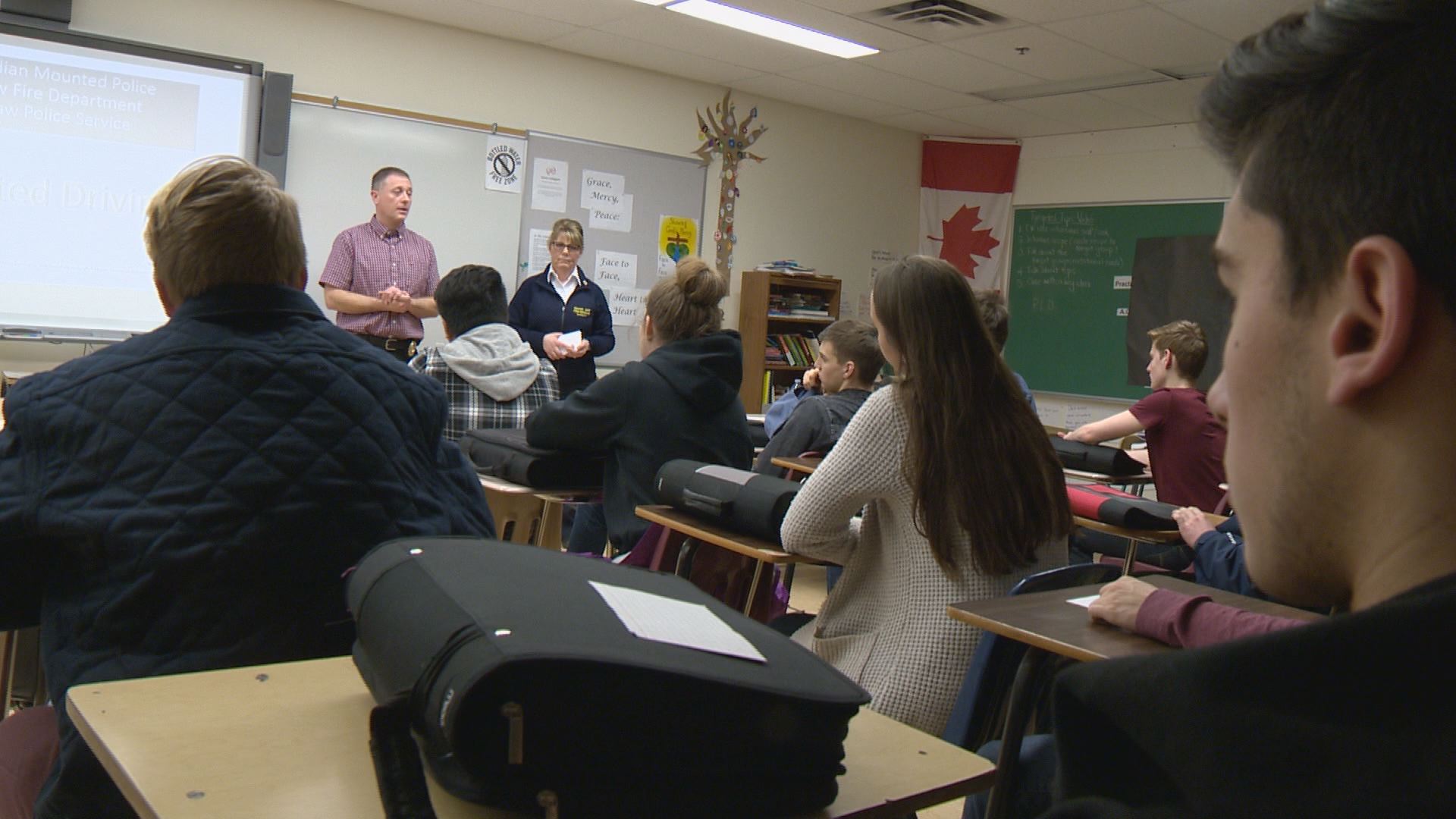 Moose Jaw’s fire and police services showed Grade 11 and 12 students at Vanier Collegiate powerful videos and shared stories about dealing with distracted driving tragedies.