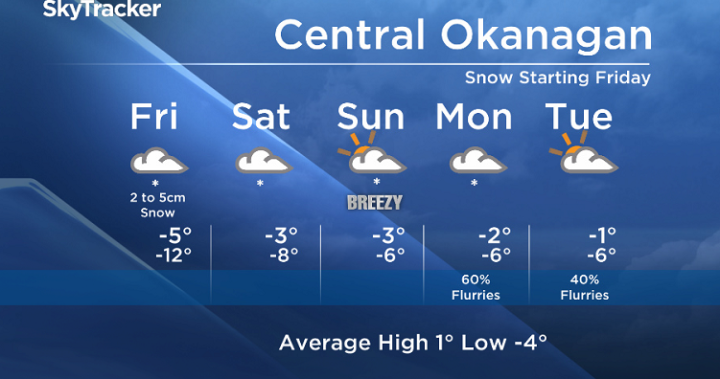 Clouds will thicken on Friday with snow developing by midday. There will be variability on snow amounts, anywhere from 2cm for some of the Southern valleys, and up to 10 cm at higher elevations for Friday.