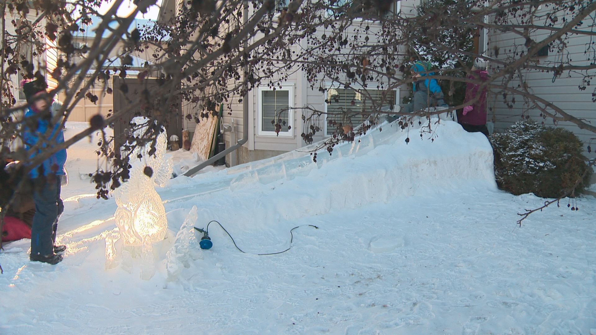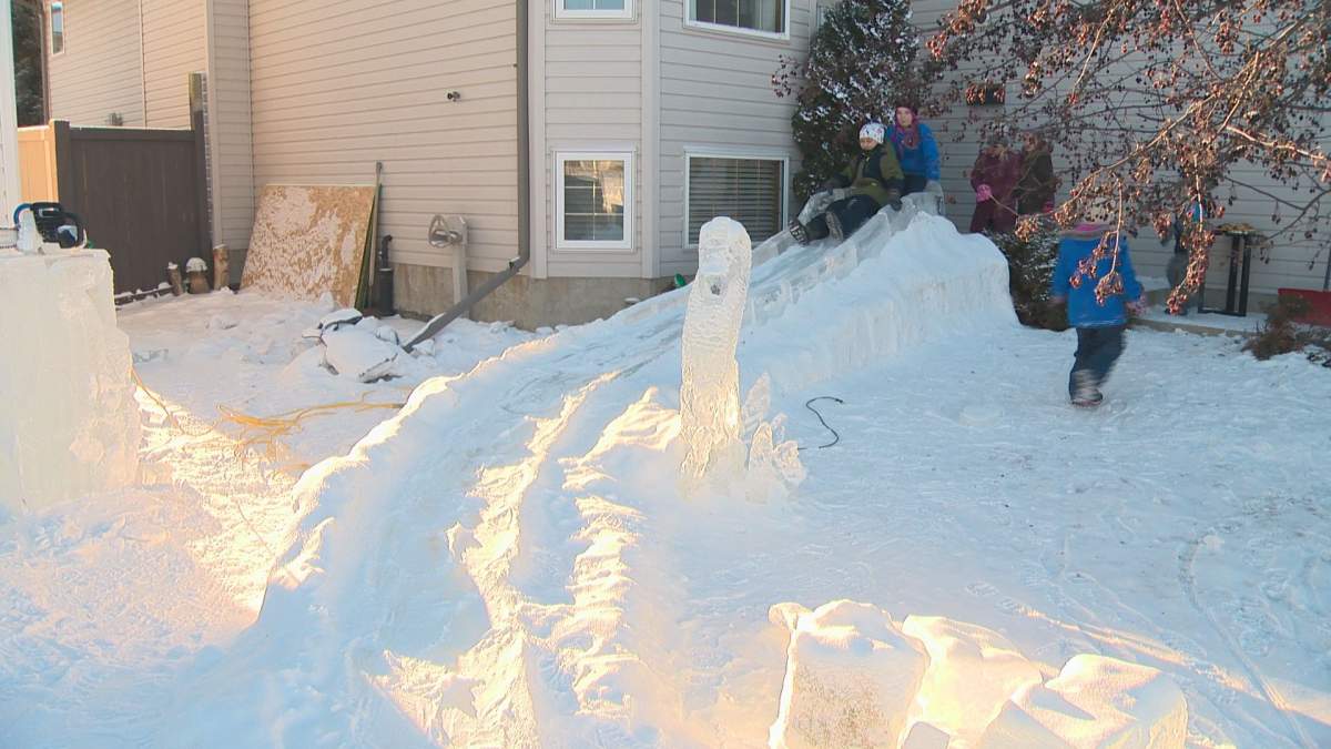 They say: if you build it, they will come. An Alberta artist is proof positive. Kelly Davies’ latest project is a massive ice slide in his own front yard.