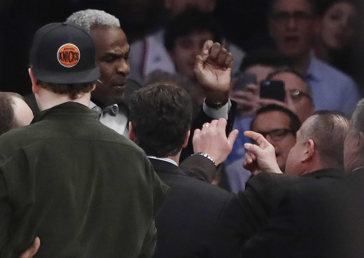 Oakley, who also played for the Knicks from 1988 until 1998, appeared to shove security guards before a group of them dragged the former NBA power forward down a tunnel and away from the scene.
