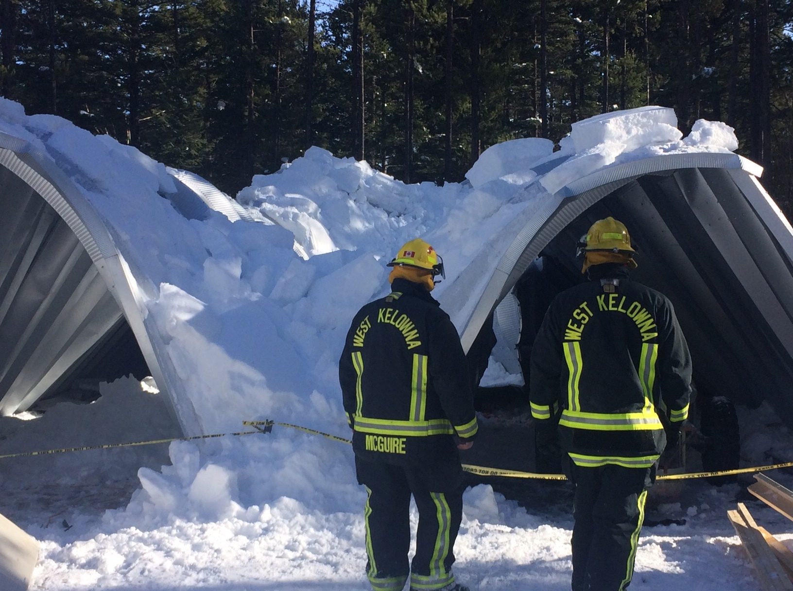 “WKFR (West Kelowna Fire and Rescue) crews made several relief cuts in the collapsed metal roof and then shored it up to create a gap around the occupant, who was then removed from the structure and transported to Kelowna General Hospital by BC Ambulance, West Kelowna Fire Chief, Brent Watson said.