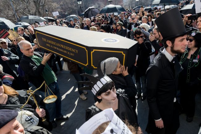 Hundreds of protesters rallied at Manhattan‘s Washington Square Park around a mock cardboard black casket that symbolically contained “The American Presidency”.