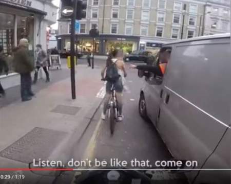 A female cyclist, somewhere in England, is harassed by some obnoxious guys in a van.