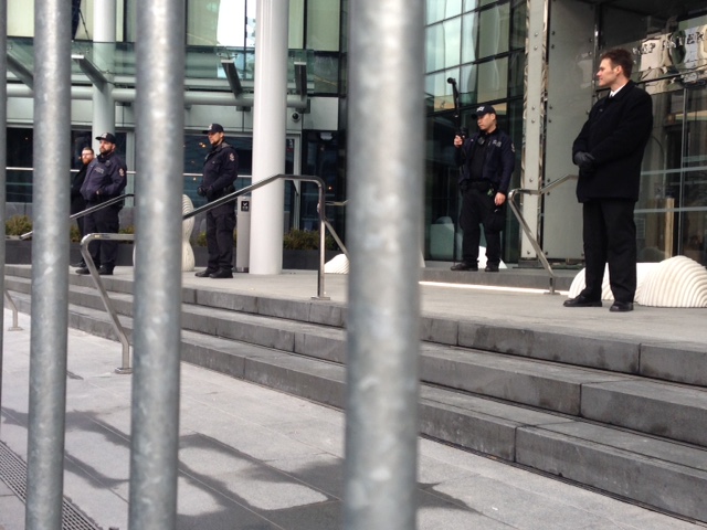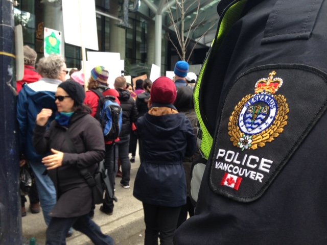 Dozens of police and security guards surrounded the Trump Tower in Vancouver on Tuesday as protesters arrived in advance of the building’s grand opening.