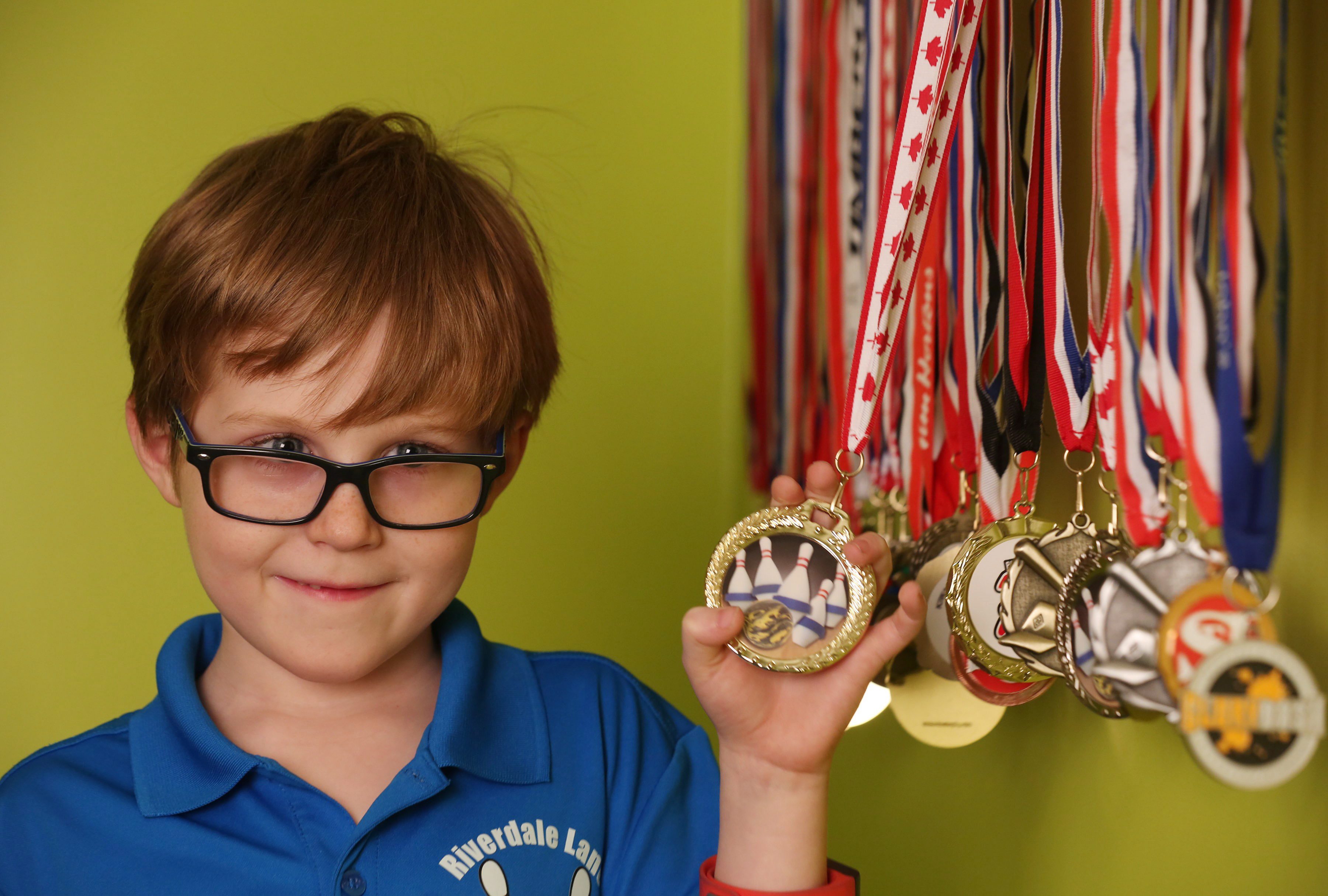 Seven-year-old Grayson Powell shows off his bowling and other sporting medals at home in Conception Bay South, N.L. on Wednesday, March 1, 2017. THE CANADIAN PRESS/Paul Daly