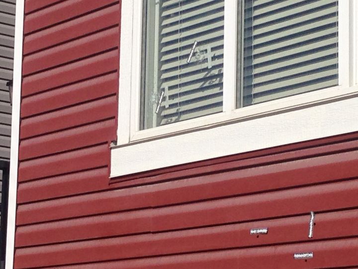 Eight bullet holes are visible in the front vinyl siding of the duplex.