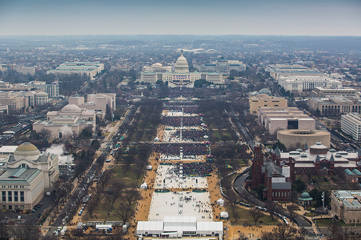 White House press secretary Sean Spicer claimed that news media photos of the inauguration were “intentionally framed in a way…to minimize the enormous support that had gathered on the National Mall.” The park service photos are from a variety of angles, both from the air and on the ground.