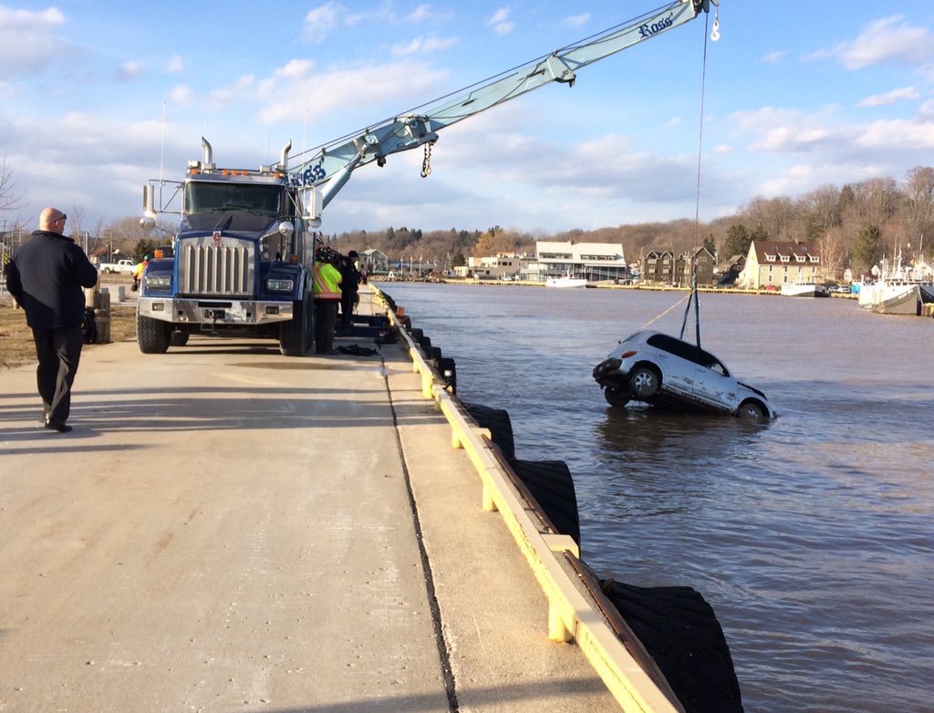 With help from police divers, Ross Towing and Transportation then successfully pulled the car — a silver coloured PT cruiser — from the water at roughly 6 p.m. Wednesday evening. Its front bumper was smashed, and the rear bumper covered in sludge.