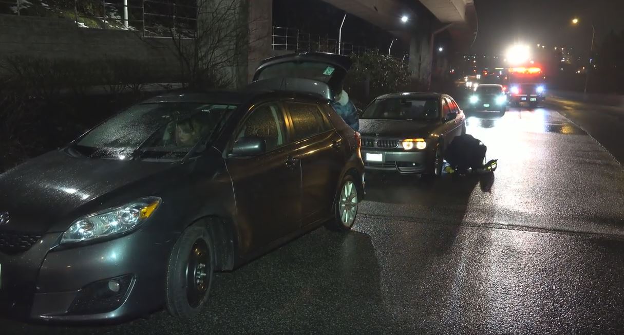 Hubcaps were scattered on King George Boulevard Wednesday night, showing the impact of the damage.