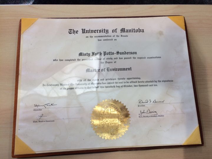 Misty graduated from Onoway High School then went to Yellowhead Tribal College. She then applied for and was accepted to a diploma program at the Centre for Indigenous Environmental Resources in Winnipeg. She met her adviser Stephane McLachlan there and went on to complete her bachelors and masters in environment at the University of Manitoba.