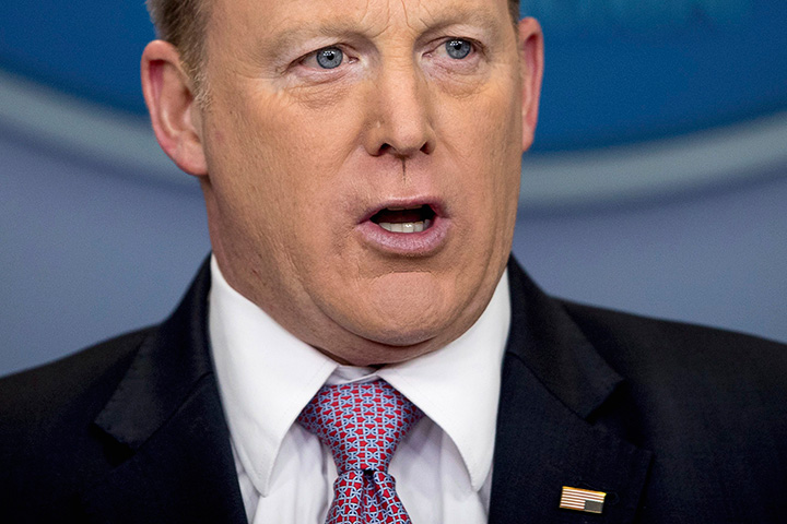 White House press secretary Sean Spicer opened his daily media briefing Friday wearing his American flag lapel pin upside down.