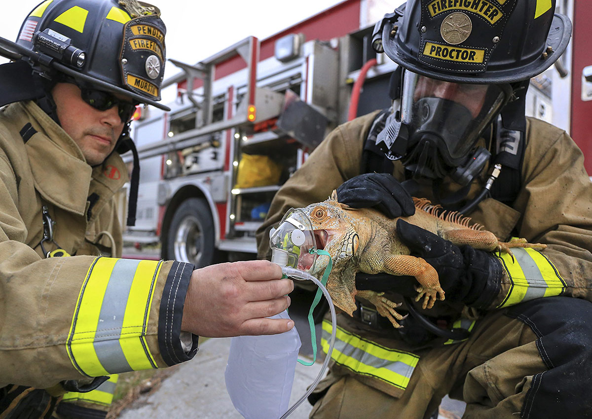 PENDLETON, Ore. – Fire crews slipped an oxygen mask over the face of a 20-pound iguana after rescuing the creature from a house fire in Oregon.