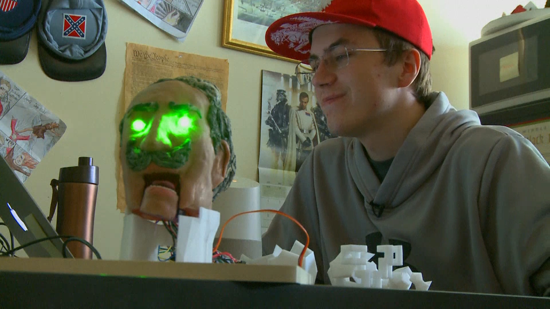 They created Kaiser Wilhelm II, the last German Emperor and the provocateur of the First World War. The tiny, 3D printed talking head has red and green flaring eyes, and angrily answers questions you ask him.