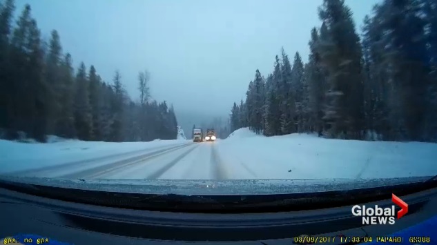 The passing semi is owned by Sutco Transportation which has offices in West Kelowna.