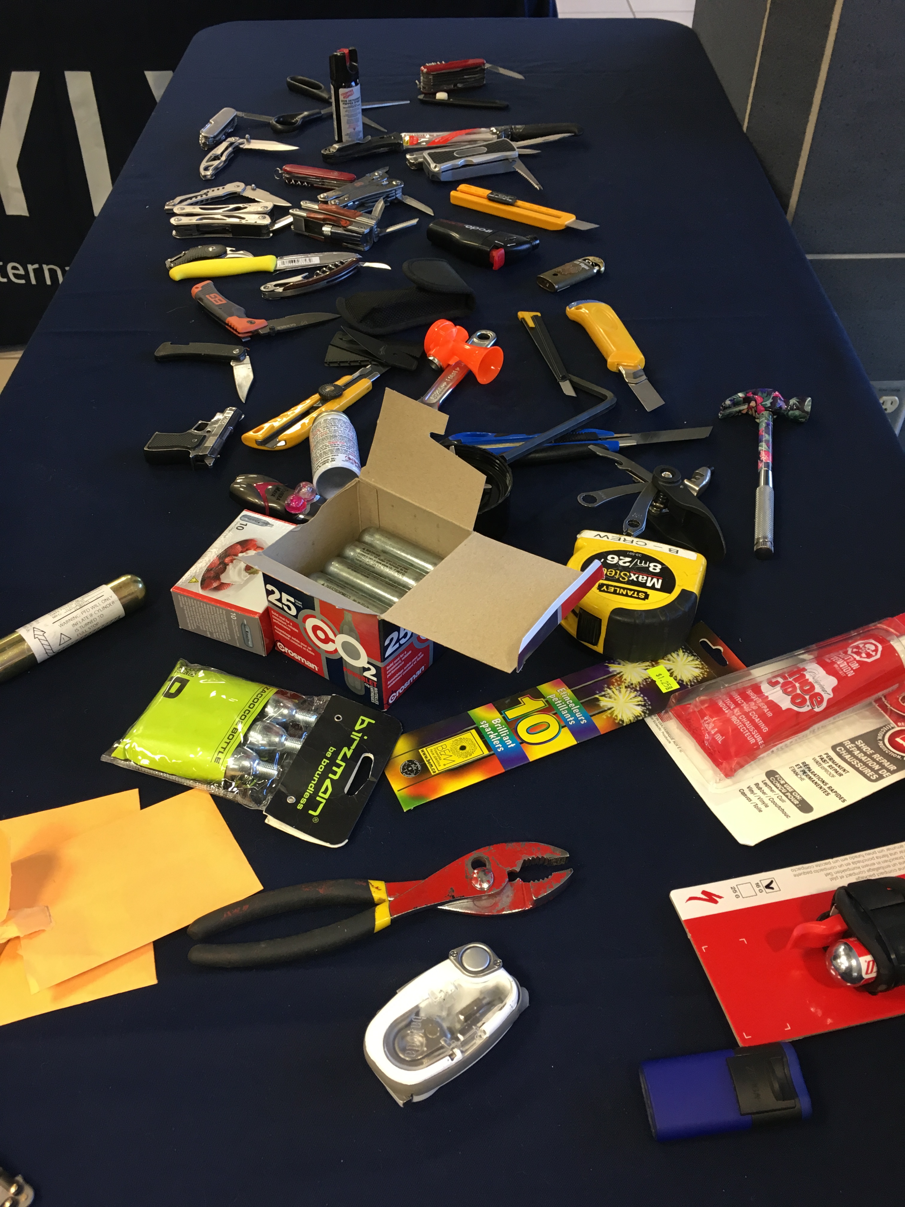 The airport displayed a table full of knifes, tools and other items all found on Kelowna passengers or in their carry-on baggage in just the last week on Thursday.