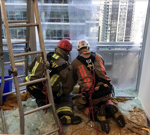 Fire crews made their way to the 33rd floor where they had to cut out the window. Multiple layers were removed one at a time. Both men were pulled safely inside more than an hour after firefighters arrived.
