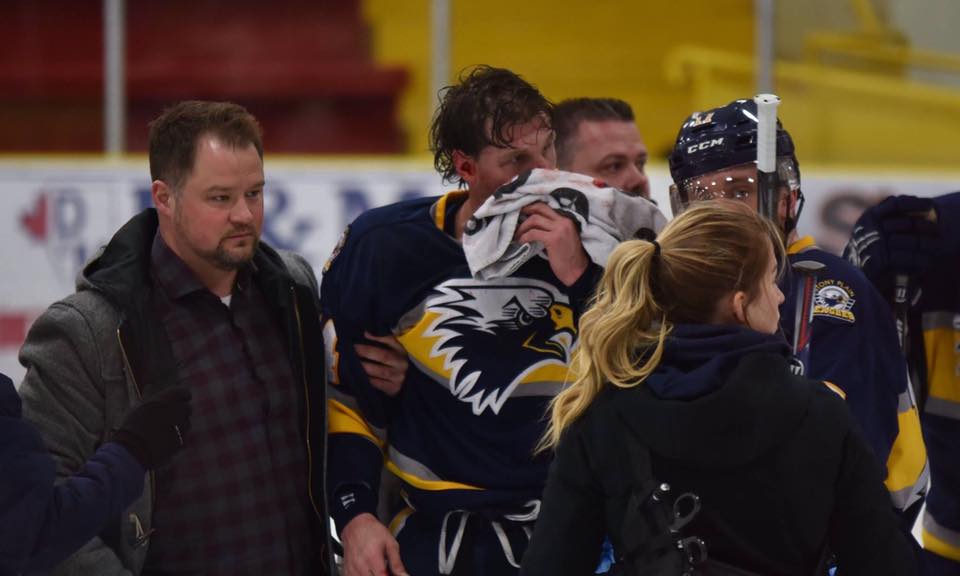 The hit resulted in Smyth “lying motionless on the ice in Lacombe as a hush fell over the crowd,” according to a memo tweeted out by Eagles’ general manager Rob Sklaruk.