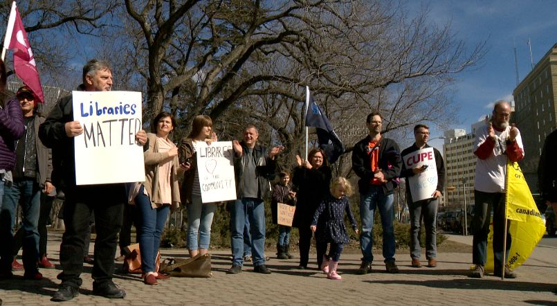 Concerned Regina residents fighting against drastic cuts to library funding in the new provincial budget held a protest Saturday afternoon in the downtown area.