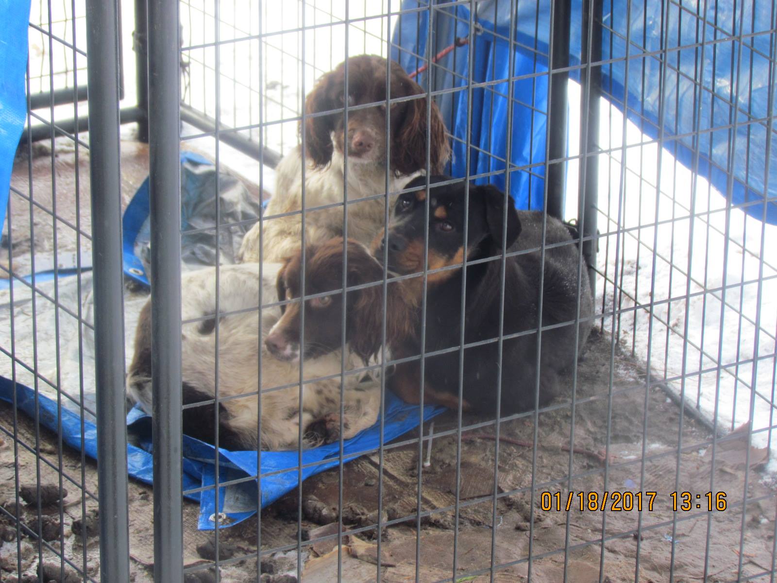 Photographs provided to Global News in January showed two spaniels and one Rottweiler huddled together in a four-by-eight-foot wire cage.