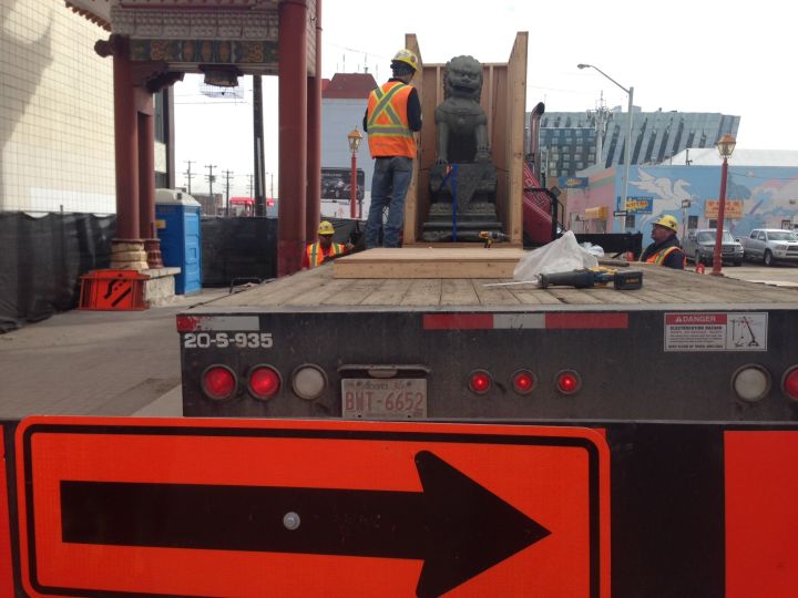 Work to remove the decorative lions from Harbin Gate was underway Tuesday morning in downtown Edmonton.