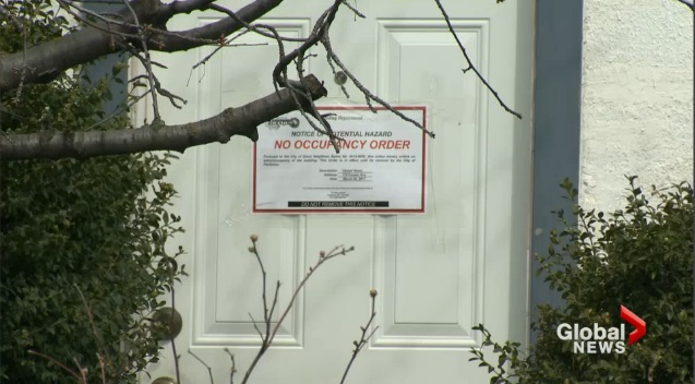 Visible on the front door of a Cossar Avenue home in Penticton is a “no occupancy order” sign.
