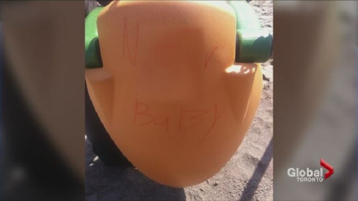 City of Mississauga crews have since visited the park and removed the graffiti from the swing and other playground equipment.