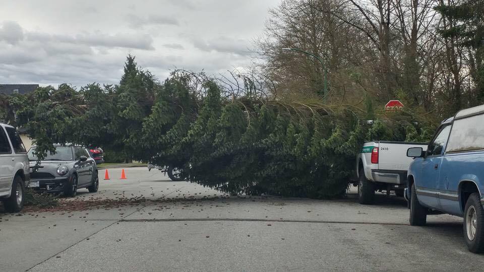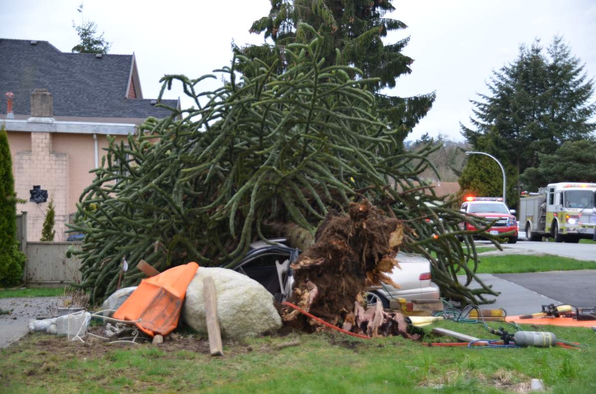 In Surrey, a tree fell on a car outside a house in the 15000-block of 86 Ave. A young girl and her mother were trapped in the vehicle and had to be rescued by emergency crews. The child has been taken to hospital with minor injuries.