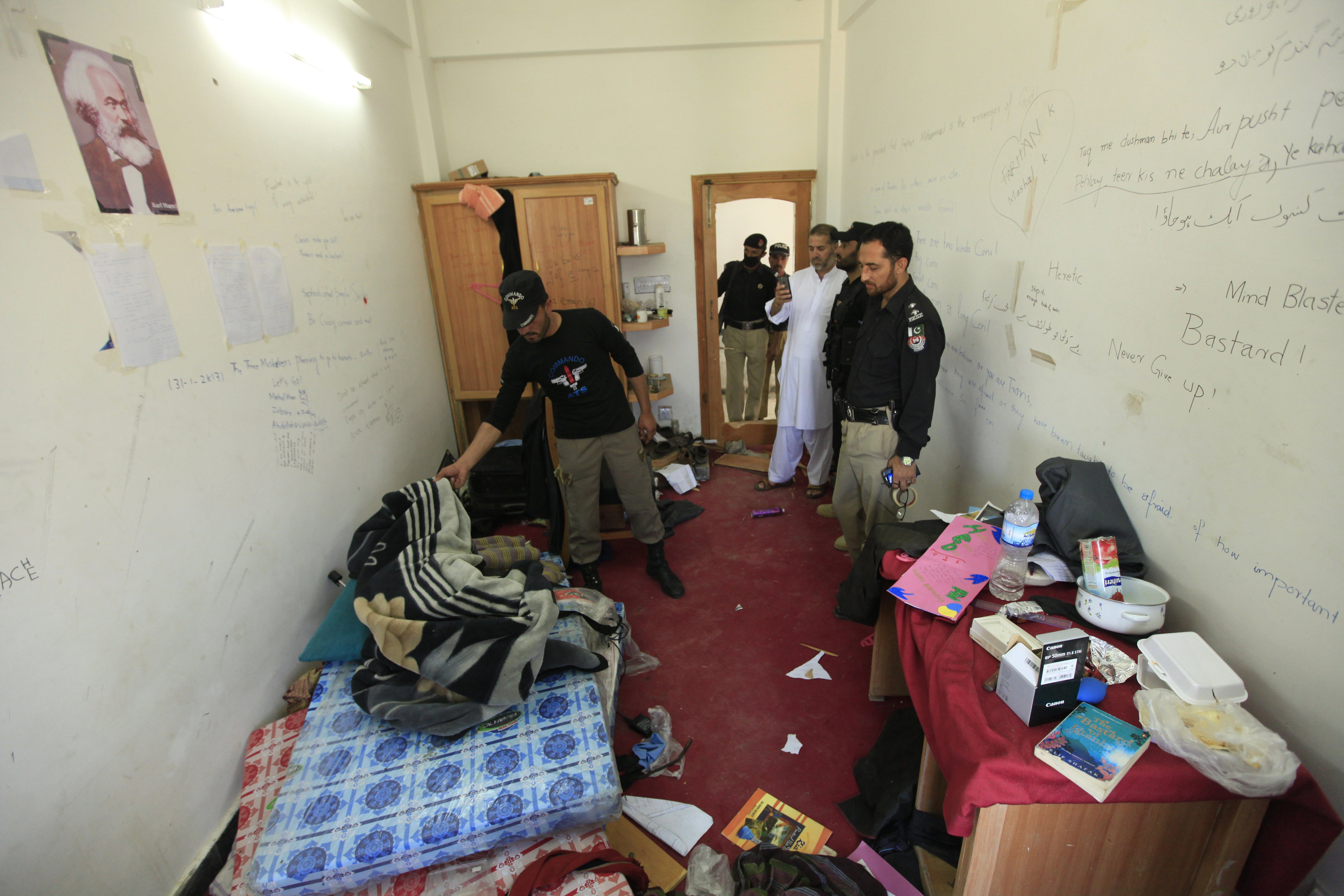 The ransacked university hostel room of slain Pakistani student Mashal Khan has posters of Karl Marx and Che Guevara still hanging on the walls, along with scribbled quotes including one that reads: “Be curious, crazy and mad.”