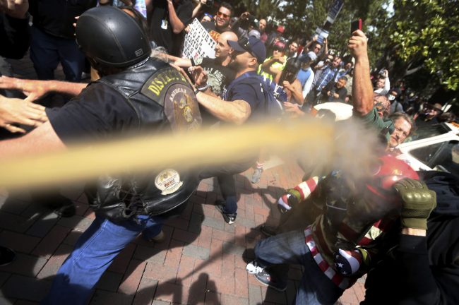 The groups then left the park and walked on Berkeley streets with police closely following them. Photographs of the scene showed at least two men with bloodied faces.