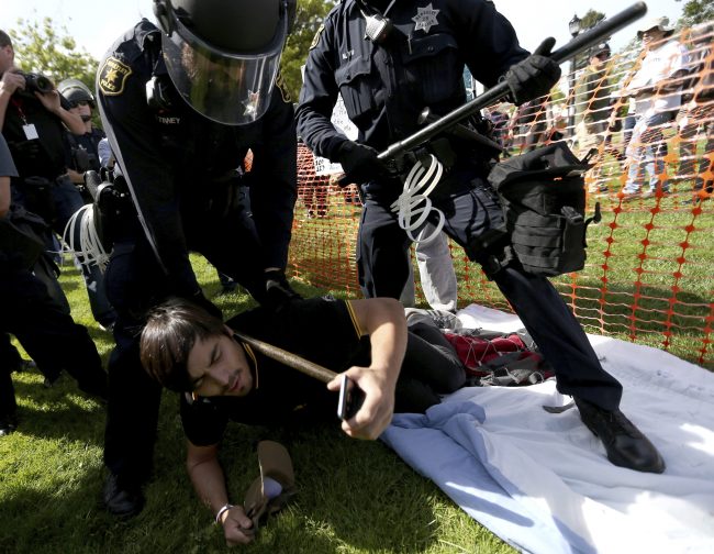 About 200 people were at Berkeley’s Martin Luther King Jr. Civic Center Park when several fights broke out. Dozens of police officers in riot gear standing nearby quickly arrested one man. Others were arrested after several skirmishes.